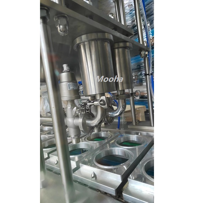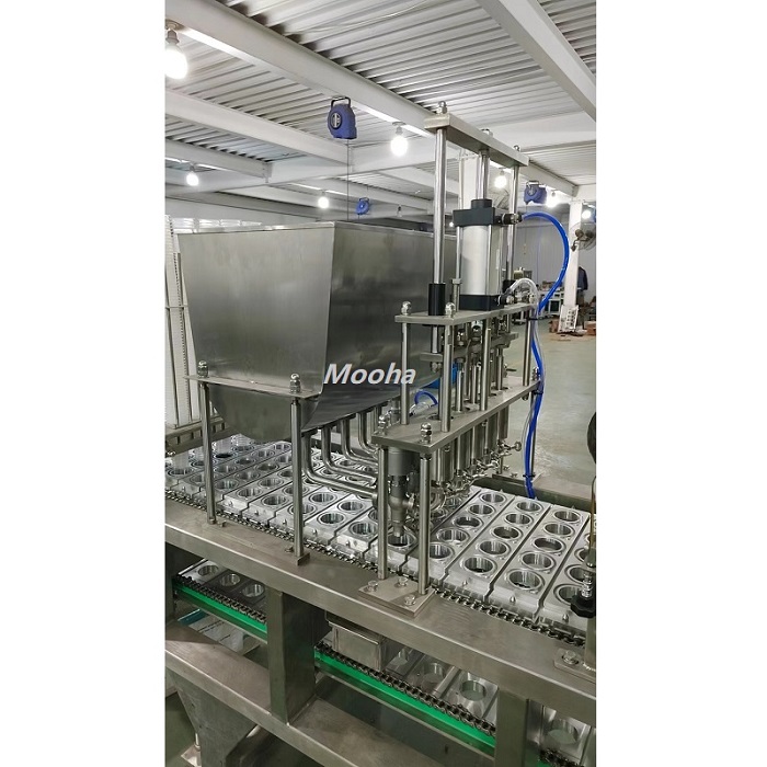 Esta máquina es una máquina llenadora automática neumática, adecuada para llenado y sellado automático de vasos y cajas de plástico. Se utiliza para gachas, bebidas, arroz, yogur, gelatina, pudín, leche, mascarillas faciales y otros envases.